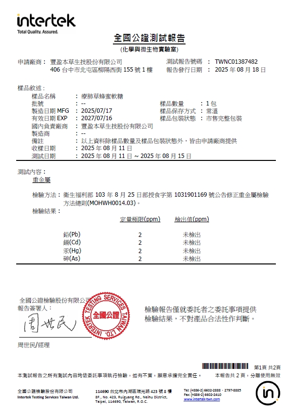 抗空污、潤喉舒緩最佳聖品 「療肺草蜂蜜軟糖」通過「沙門氏菌、金黃葡萄球菌」、「重金屬」食品安全檢測。